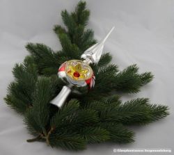 Diese wunderschöne Baumspitze ist ein Hingucker und DAS Highlight an jedem nostalgischen Weihnachtsbaum. Sie wurde von mir in liebevoller Handarbeit mundgeblasen, mit einem wunderschönen Blütenreflex versehen, verspiegelt und von meiner Malerin mit klassischen Silber-und Weißtönen bemalt. Hergestellt in Siegmundsburg/Thüringen - Qualität Made in Germany