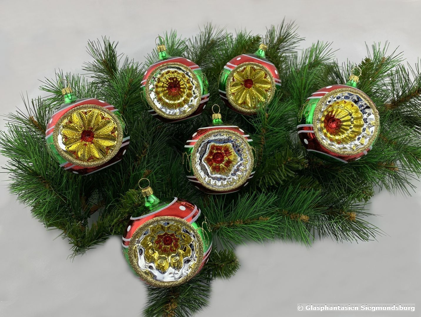 Nostalgisches Reflexkugelsortiment Grün-Rot-Gold dekoriert 6 Kugeln in einer Box, sie haben ca. 80 mm Ø Für jede Reflexkugel wurde ein spezieller Reflexstempel mit unterschiedlichem Motiv verwendet, alle sind mundgeblasen, von uns Hand-verspiegelt und von meiner Malerin mit „alten“ Mustern traditionell bemalt. Hergestellt in Siegmundsburg/Thüringen - Qualität Made in Germany