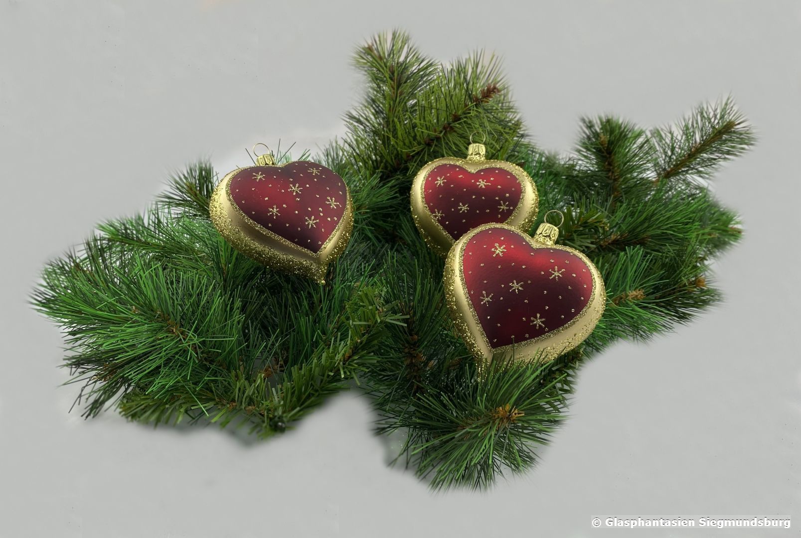 Produktinformationen "Herzen 7 cm 3er Set, Dunkelrot, Vorderseite Baumgruppe Gold Rückseite Sternendekor, Durchmesser ca. 7 cm"